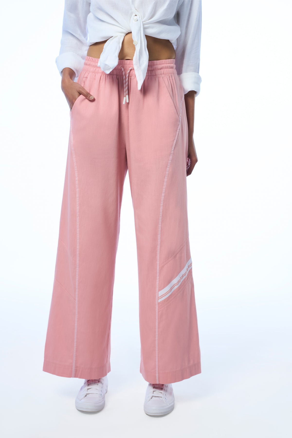 Contrast stitch seam detailing along the leg - Linear stitch accents designed to elongate the silhouette.